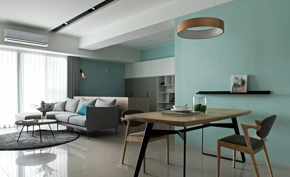 青绿色的墙面搭配原木风的餐桌椅,简洁的吊灯和隔板搭配,整个餐厅空间虽然不是很宽敞,但让人感觉格外的轻松、舒适。