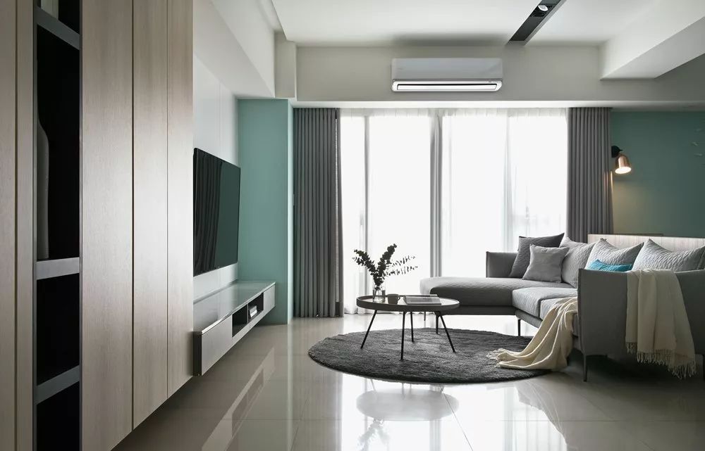 鞋柜一直延伸到了客厅处,木质的柜子和电视柜结合起来,电视形成了嵌入式的设计,灰色的沙发和窗帘相互呼应,更显简洁。