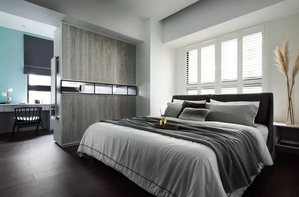 主卧室的空间比较宽敞,分成了休息区与工作区,以灰木色的衣柜作为隔断划分两个空间,简约的床品搭配百叶帘,轻松自在。