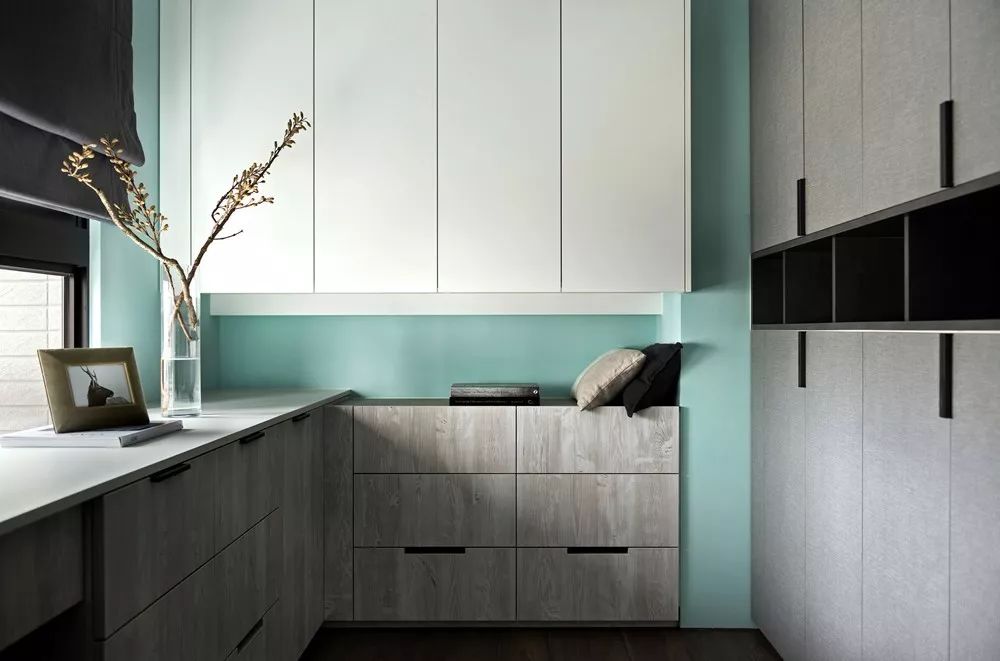 办公区内的书桌连着柜子一起设计,上方还做了白色的吊柜,墙面延续了客餐厅的青绿色,避免了大量柜子带来的压抑感。