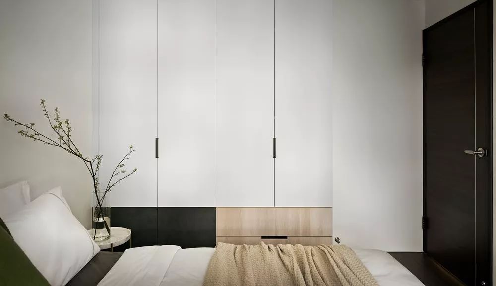 在次卧的另一侧是嵌入式的衣柜,上方大面积的白色柜子和底部的黑色、木色柜子形成一种对比的感觉,也对应了次卧的主要色调:白墙、木床和黑门。