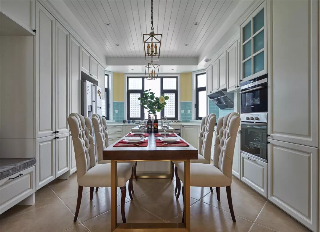在入户门的另一侧是餐厅和厨房空间,正中摆放的餐桌椅,左右两侧都做了满墙的柜子,还留出了换鞋凳的区域,冰箱和厨房电器都被嵌入了柜子当中。