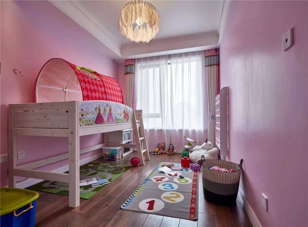 儿童房内用了粉色作为主调,把床给抬高部分,底部留出更大的空间给孩子玩耍,随意摆放的卡通玩偶也让儿童房更显童趣。