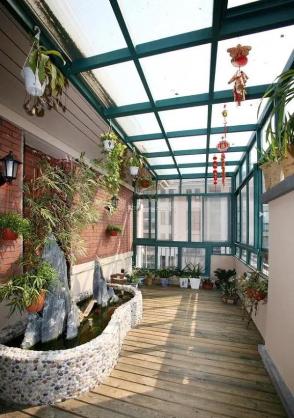 玻璃式吊顶:利用透明、半透明或者彩绘玻璃作为阳台顶面,采光充分,视野开阔,清新时尚。