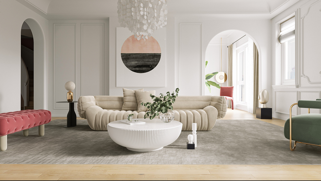 奶油风家居空间中,通过设计技巧改变了原户型结构的冷硬之感,整体硬装以及家具,都给人一种柔和的感觉。墙面的棱角处、门洞等等,均选择做弧形设计,用曲线取代直线,柔化空间。家具的造型也多选择比较圆润的造型,整体会更加柔和。