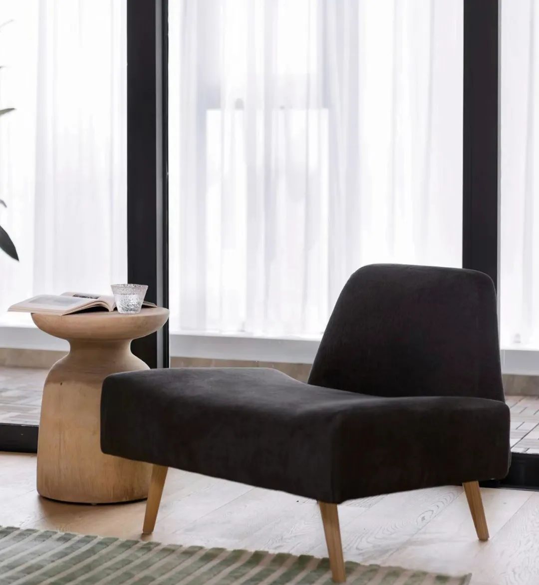 ▲ 阳台一角,灰色单椅搭配复古边几,玻璃移门隔断阳台与客厅区域,空间通透明亮。