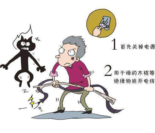 发现有人触电要设法及时关断电源。然后用干燥的木棍等物将触电者与带电的电器分开,不要用手去直接救人,以防两人同时触电。