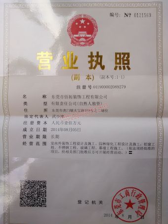 ★公司简介★ 东莞佰拓装饰公司专业承接各类装修业务,我们一直秉承“以质量求生存,以信誉求发展”的经营理念,本着“诚实做人,踏实做事”的原则,始终坚持以客户的需求和满意为核心,最终以优质、精美、具有创造力的空间装饰赢得客户最大化的满意。 在装饰行业中公司始终以新颖、实用的设计风格与精良适用的选材给予合理的价格,对每个项目施工以高质量标准检验每一道工序且力争达到最优,同时有良好的合同履约能力与售后服务能力,使得我们拥有了更多的回头客户。 公司发展就要不断的学习新事物,总结行业经验,是佰拓装饰上下员工的一惯作风,在装饰行业日趋规范当中不进步就会被淘汰的今天,我们凭着对事业的执着及认真的工作态度,加上创新的思想理念一路前行,是我们的客户群给予我们最大的支持,我们时刻把客户比作镜子,始终看清自身,因为有了客户这面镜子的存在,我们也就有了更加坚定的信心来迎接更美好更灿烂的明天! ★服务项目★ 室内外装修设计及施工,园林绿化工程设计及施工,门窗工程,不锈钢工程,幕墙工程施工,商场,酒店,KTV,酒吧。