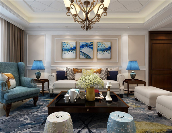 3、整个空间,结合了一些现代元素,像吊顶和油画,这些都是比较现代化的配置。空间的主色调是蓝色,使得整体家居明亮温馨。