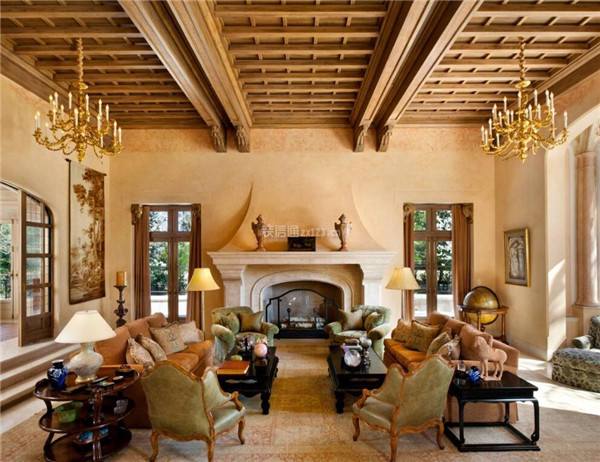 以华丽的装饰、浓烈的色彩、精美的造型达到雍容华贵的装饰效果。欧式客厅顶部喜用大型灯池,并用华丽的枝形吊灯营造气氛。门窗上半部多做成圆弧形,并用带有花纹的石膏线勾边。室内有真正的壁炉或假的壁炉造型。墙面用高 档壁纸,或优质乳胶漆,以烘托豪华效果。