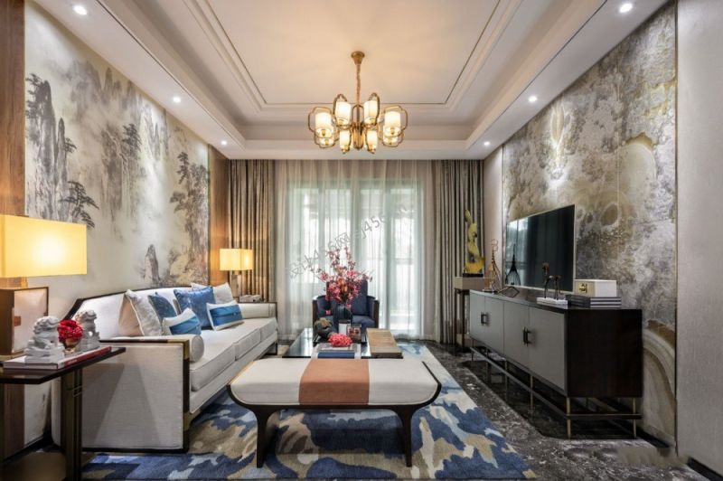 115平米现代中式风格三居室客厅软装装修案例