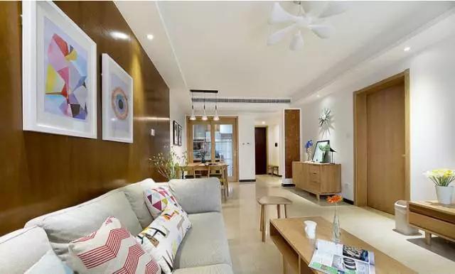 沙发背景墙颜色较深,挂上几幅色彩清新亮丽的艺术画来减轻压抑的视觉感,浅灰色的布艺沙发搭配浅色的原木家具,营造出温馨质朴的居室氛围。简约的设计带来了时尚舒适的生活感受。