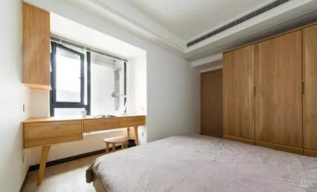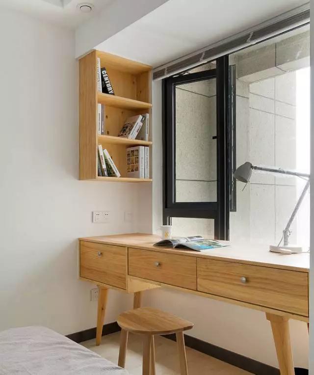 卧室装饰从简,没有过多的装饰与束缚,因为卧室就是休息的地方,简单感带进放松感。书桌所带的各种型号的抽屉满足不同的收纳需求,很实用。