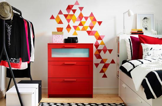 被靓丽的颜色搭配惊艳。鲜活红色的三层收纳柜,居中而立,像一个忠诚的守护者,搭配墙上橙黄红色交接的三角装饰图案,一下子就把观者揽入到一个绚丽多彩的活力世界。黑白波点地毯沿床而设,铺展出一抹简约时尚的家居格调。黑色晒衣架利于紧挨墙面,为常穿衣物提供可很好的安置之处。整齐排列的简约储物盒,很好地利用了剩余空间,增加收纳空间的同时也成了很好的卧室摆设。另一侧床的搭配亦是斑斓簇拥。床头板的装饰和收纳,也体现了卧室主人饰家的精细用心。