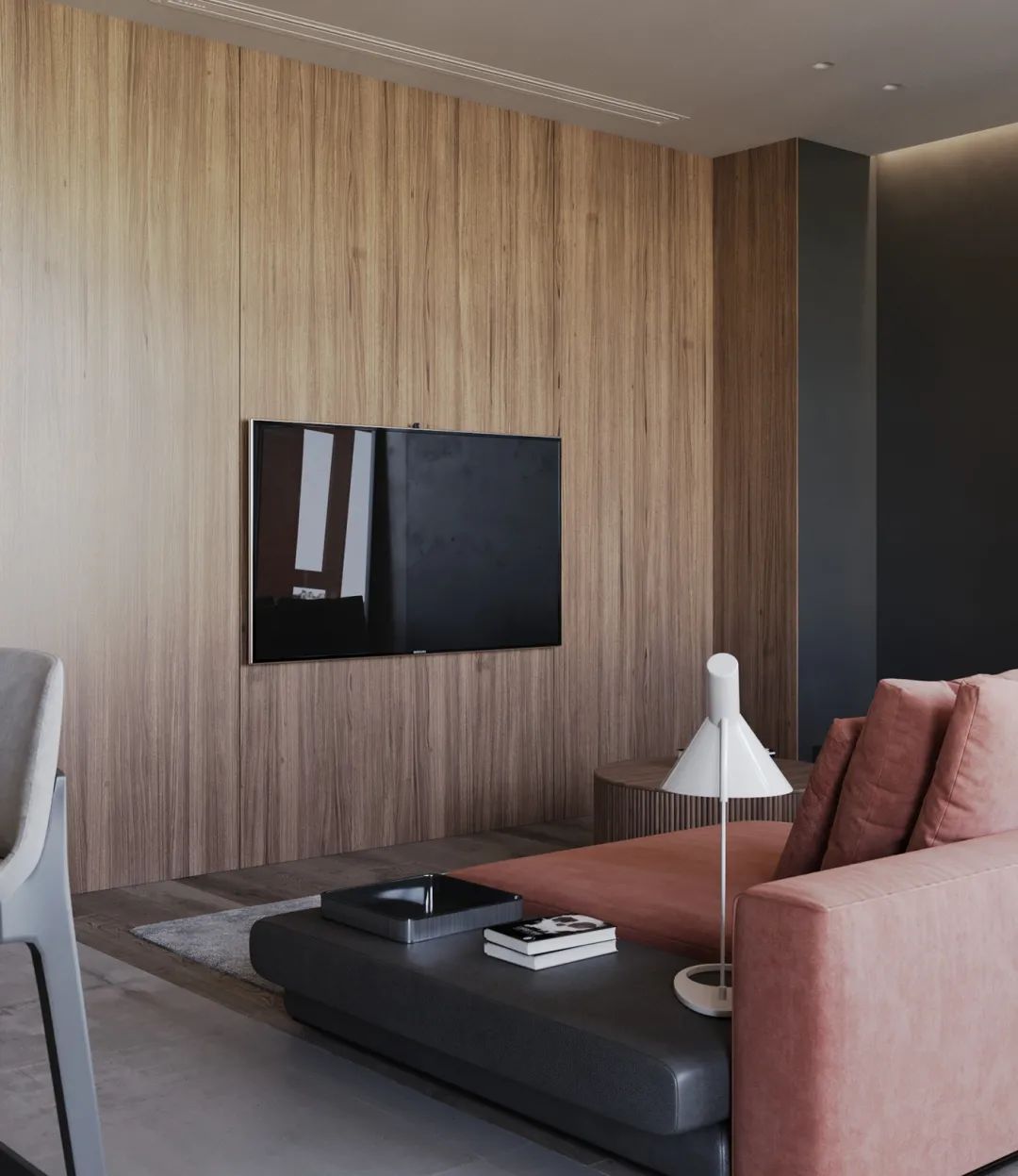 ▲客厅电视墙以木饰面的材质设计,侧边墙面则是以高级灰的装饰,天花上暗藏的灯带槽,反射出来的暖调灯光,也让空间显得更加温馨简约而大方。