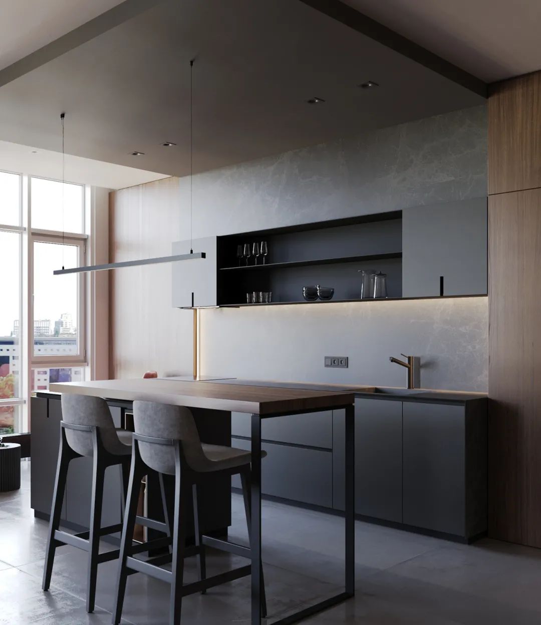 ▲客厅与餐厅旁边的是开放式的厨房+吧台,整体灰色的空间硬装与家具,结合温馨舒适的灯光布置,也显得更加温雅而高级气质。