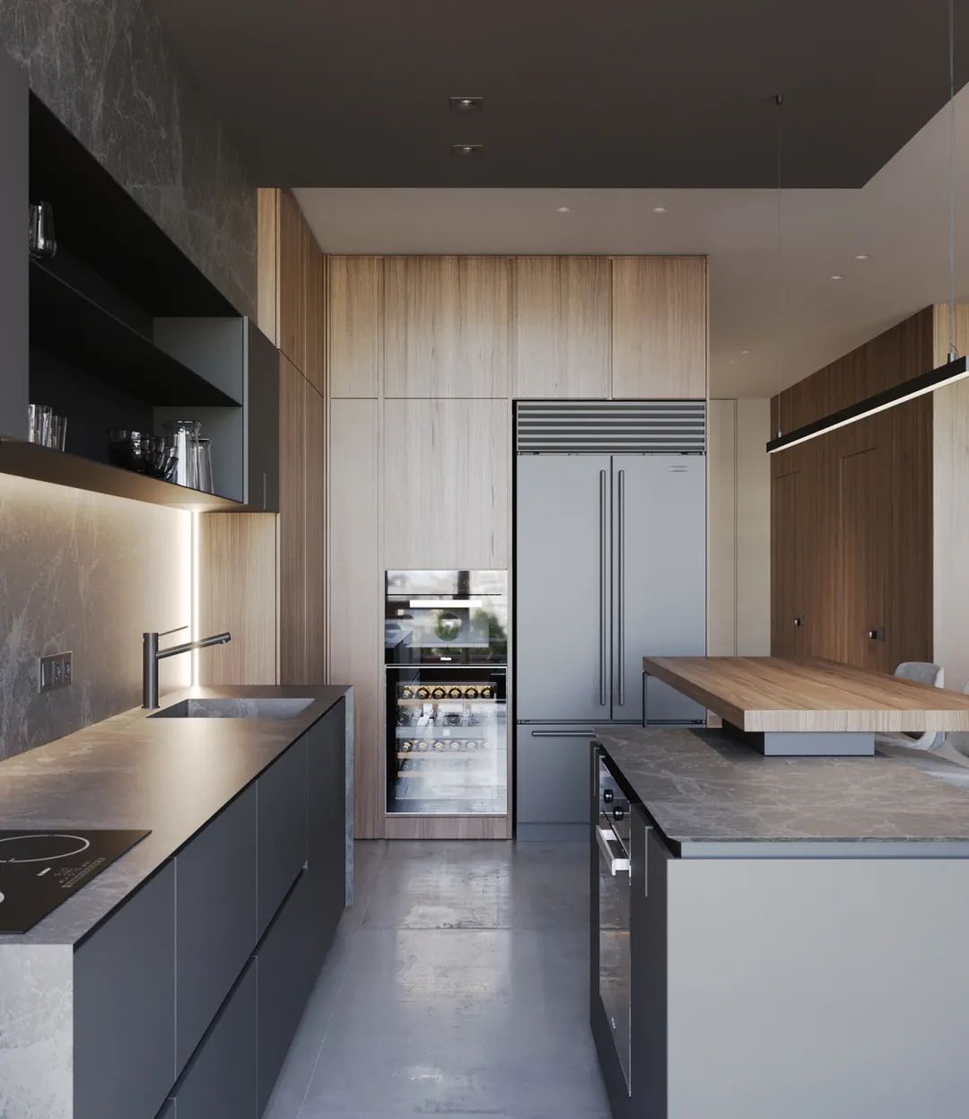 ▲吧台与厨房的形成二字型的操作台布置,侧边嵌入柜体的电器与冰箱,在保持简洁空间的基础上,也带来了一个优雅实用的空间感。