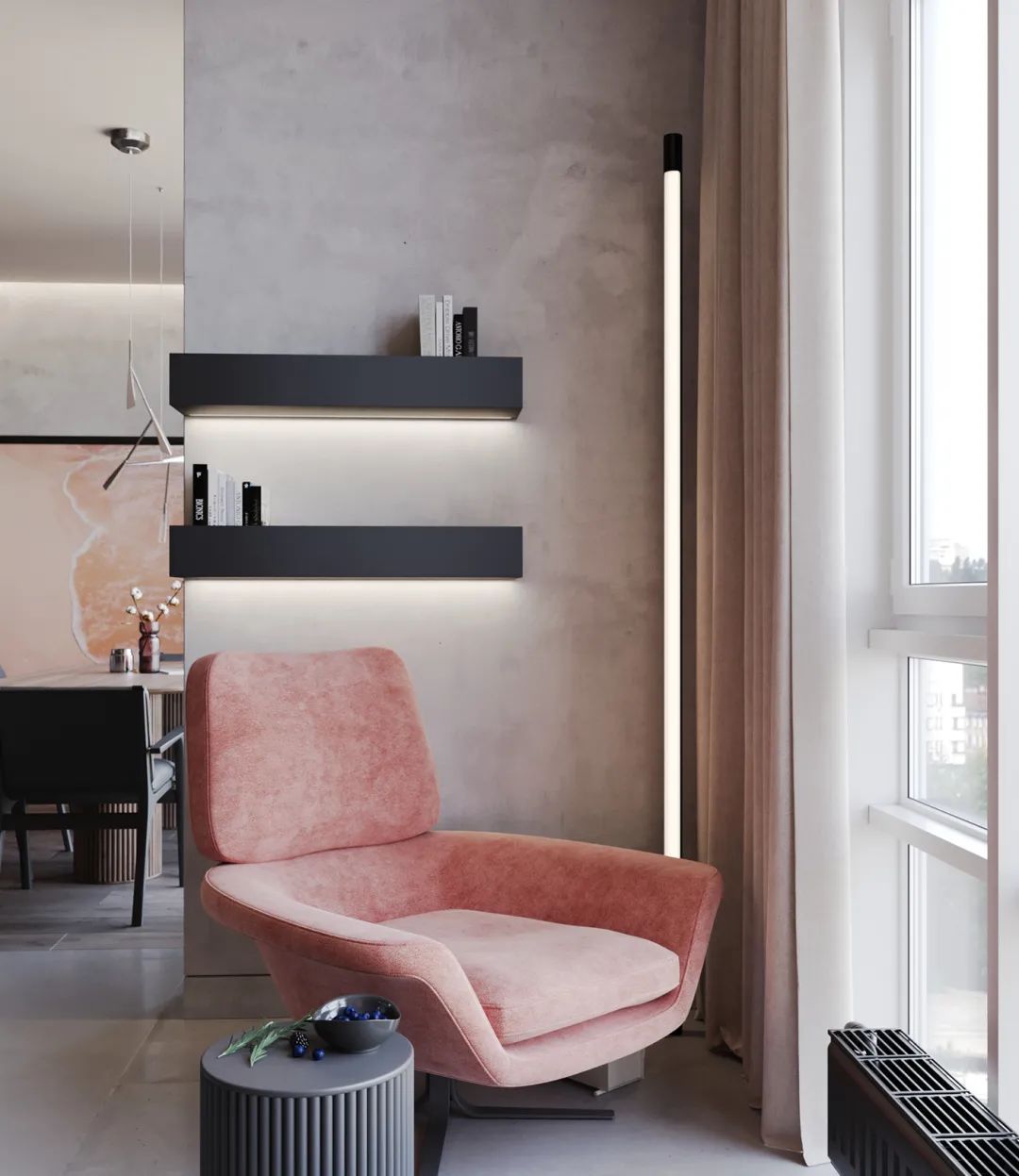 ▲粉红色的休闲椅,后方的定制书架,结合线性的灯光设计,显得时尚明亮而高级。