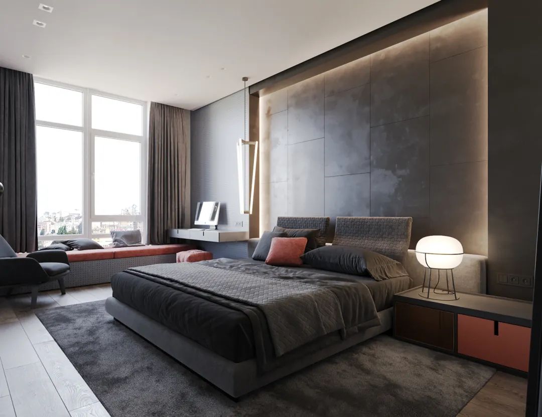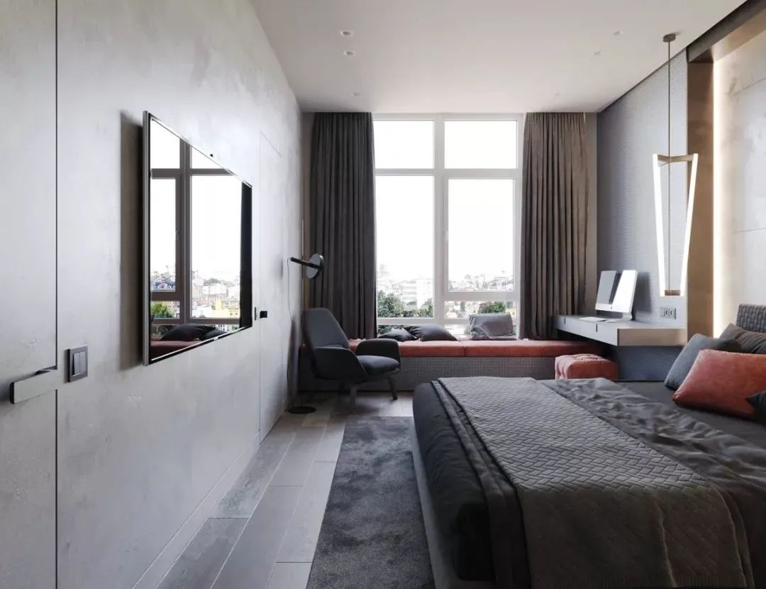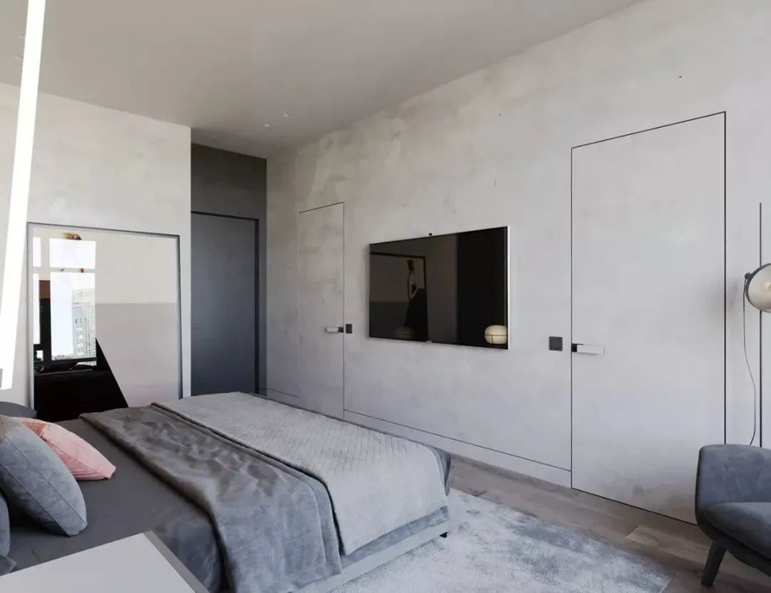▲床尾挂上电视机,整体水泥灰色的墙面,把房门隐藏在中间,显得更加简约高端。