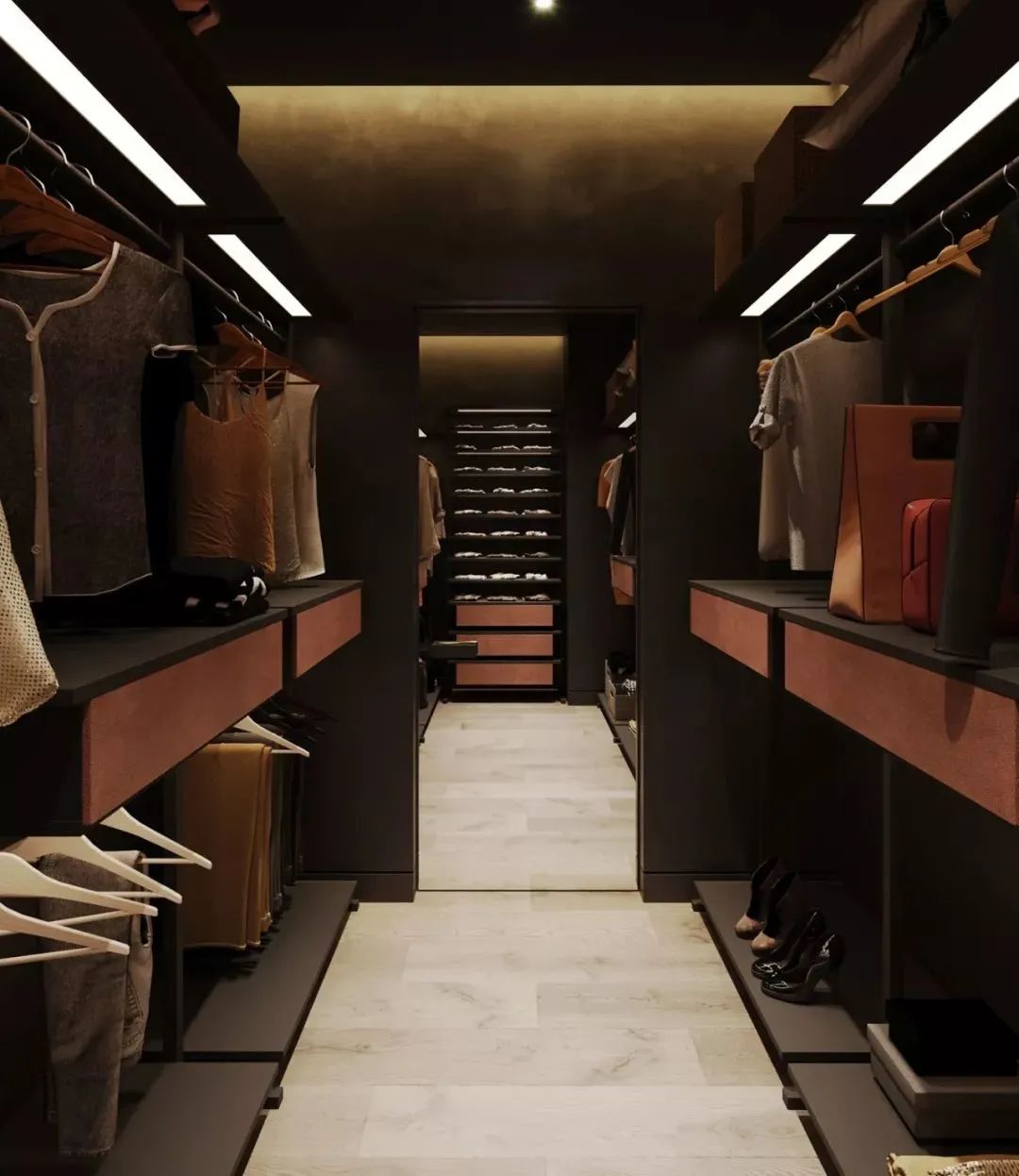 ▲衣帽间在深灰色的空间下,大面积的挂衣区装上灯带,整体实用而又时尚。