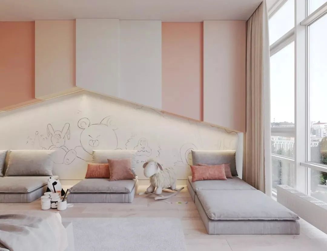 ▲灰色床与地毯,点缀粉色的软装细节,让空间显得充满惬意童趣的优雅氛围。