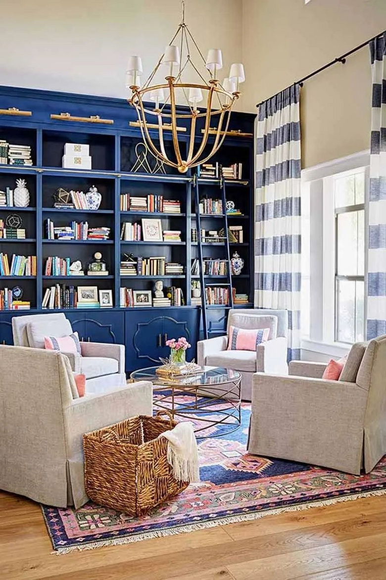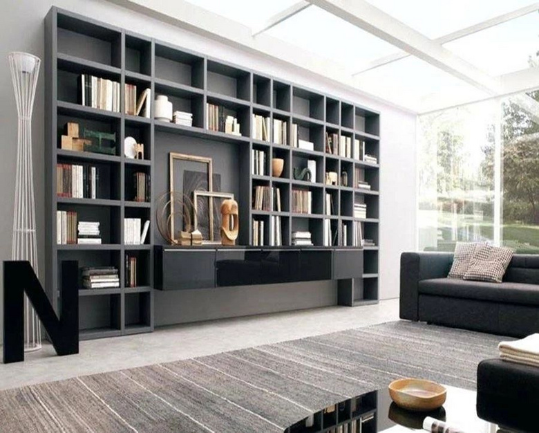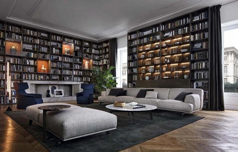 如果客厅够大,四面墙都规划为书柜,是不是很有气势!