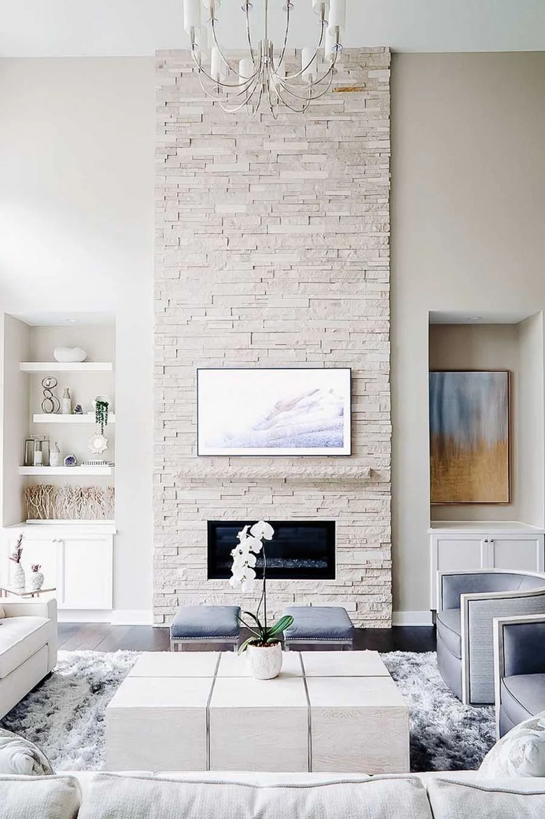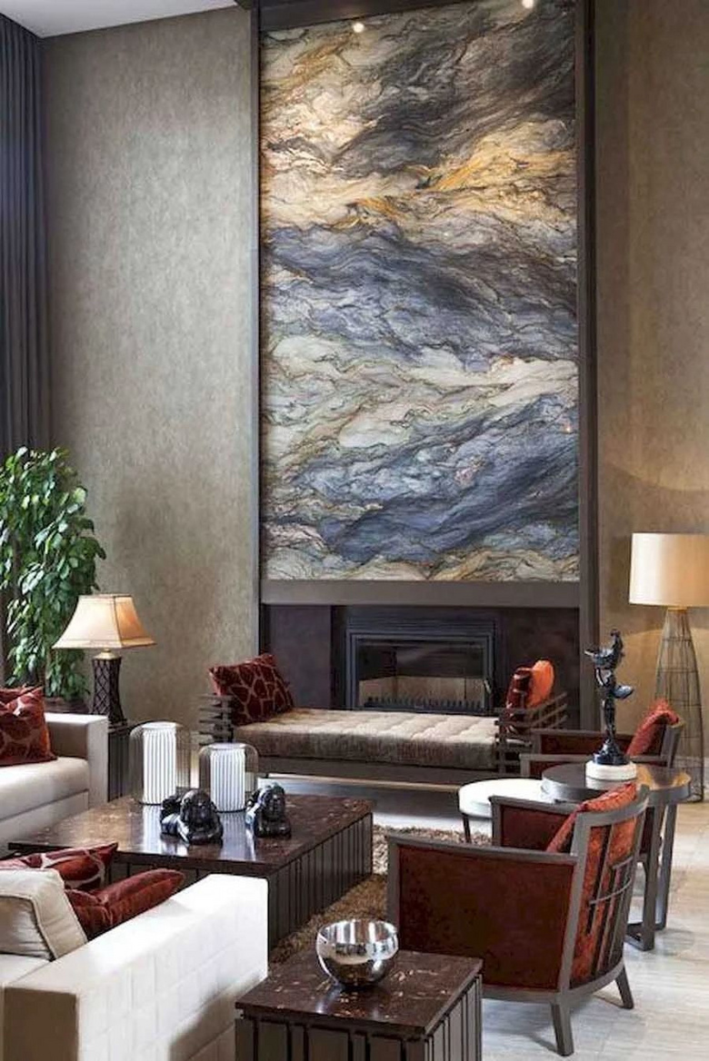 向往干净的墙面设计,那么就运用石材、瓷砖布置墙面吧!尤其是石材,一向是豪宅、别墅最爱的装修元素,不仅飘散一股沉稳质感,天然纹理更挹注一丝自然气息,给予客厅完全不同的大气魅力。
