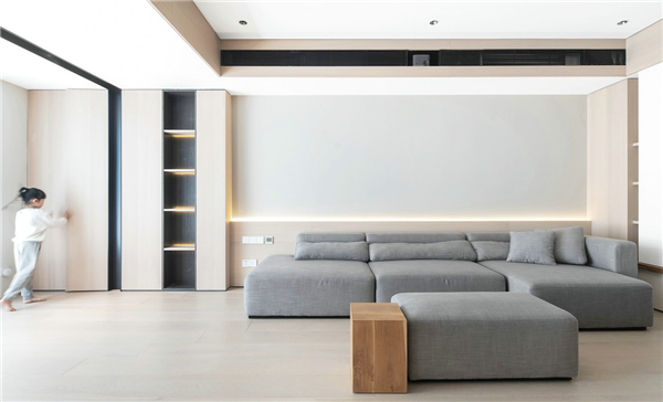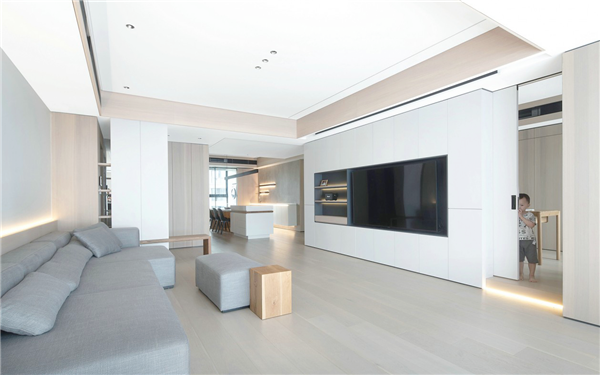 电视背景墙是一整面白色的收纳柜,中间留空设计,放置电视机和金属铁件发光层板,简洁的线条将装饰与实用兼顾,突出现代风格的独特美感。恰当好处的灯光,给人舒适、简洁的居住氛围享受,坐在沙发上看着孩子光脚在地上跑动,一家人其乐融融充满幸福感。