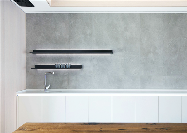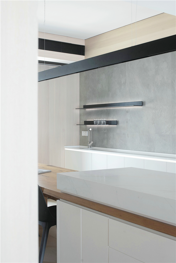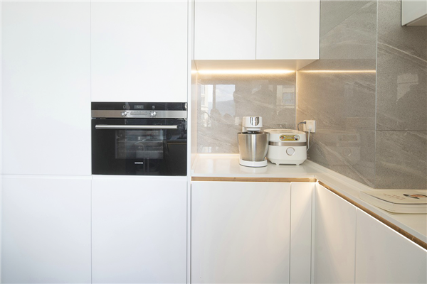 推开门进入的是厨房内部,电器都是嵌入式,保证视觉的完整性节省了空间,打造干净整洁的案台。在这里可以感受极简主义之美,白色橱柜与灰色瓷砖相搭,极度和谐,一日三餐皆心情愉悦。