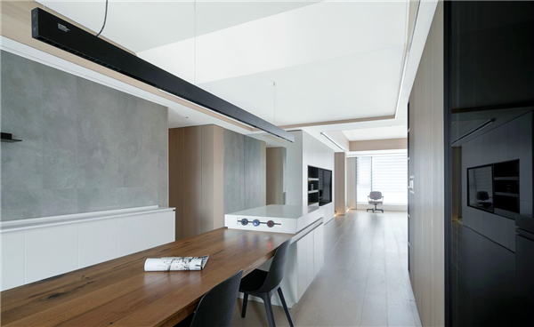水吧台既是增加餐厅的储物空间,也缓解了厨房使用上压力,岩石板和金属铁件发光层板,与客厅电视柜材质一致,充满现代感,打造出干净、利落的用餐空间。