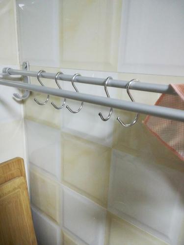 厨台上的小东西容不下太多的东西,然后要学会借助墙面空间。套筒套筒套筒与S型挂钩是最常用、最实用的组合。这在日本,这是每个家庭必备的收纳道具。