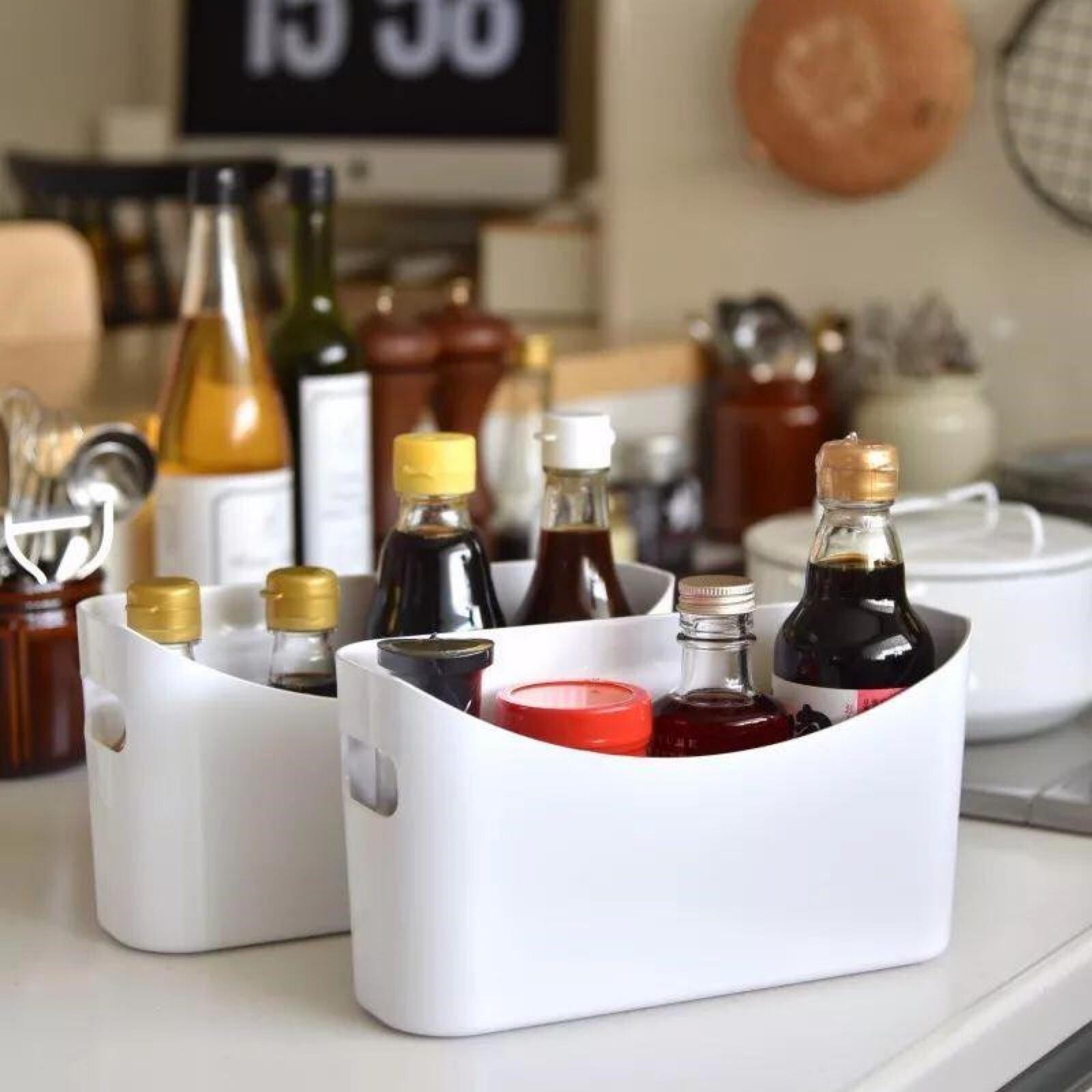 带把手的收纳盒也很好用,它可以放在柜子里,或者放在冰箱里,用来收纳大小形状不一的配料。用这样的收纳箱,拿东西会更方便些。