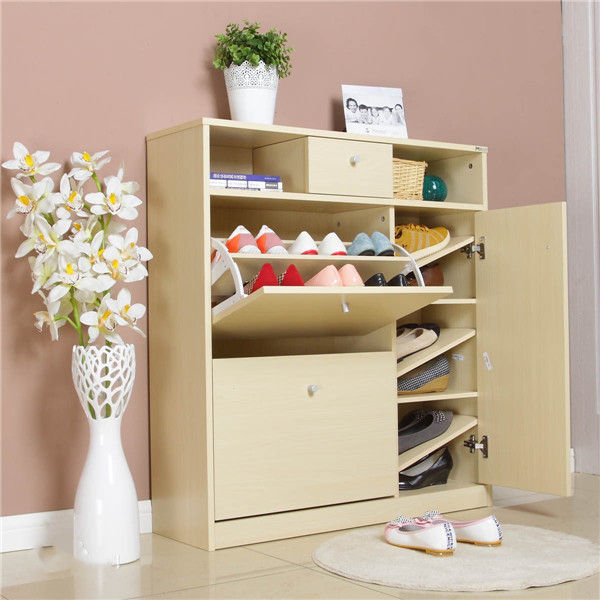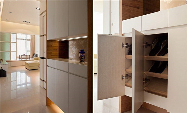 1、鞋柜高低层设计,矮层无法摆下高帮鞋、靴子等,或者选用可活动层板,这样也可以灵活使用。