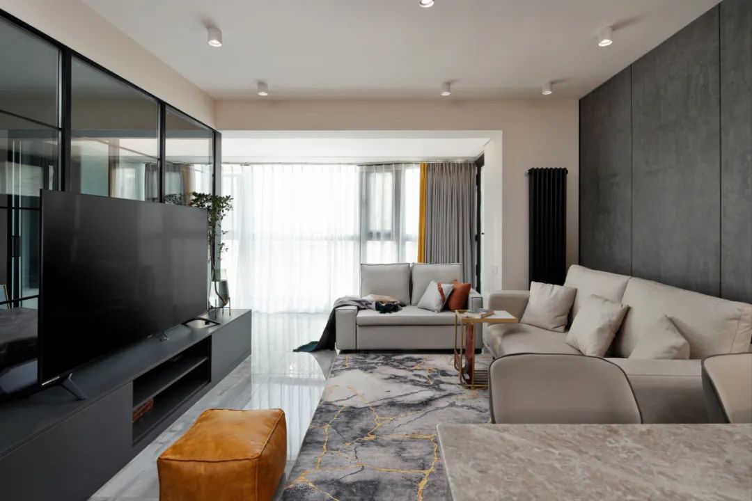 ▲客厅整体以轻奢现代的空间基础,黑与灰色的主体设计,点缀上精致鲜艳的细节装饰,在无主灯的空间下,小户型也充满了华丽端庄的优雅感。