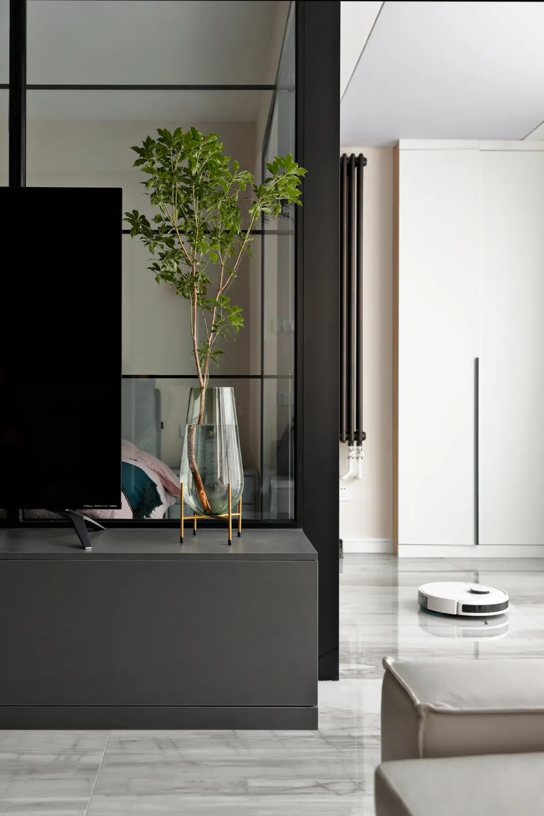 ▲电视墙后方就是卧室区域,以玻璃隔墙的设计,布置灰色电视柜,整体显得更加通透而又现代时尚。