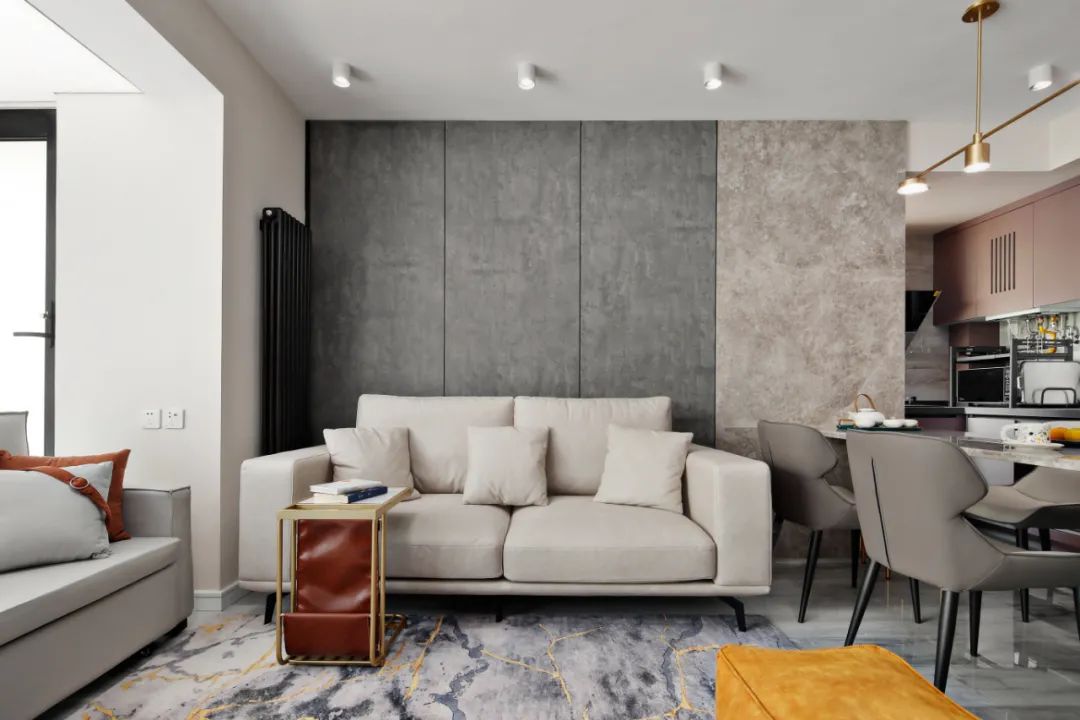▲沙发墙以复古灰的硬包为背景墙,摆上米白色的皮沙发,简易的金属小茶几,橘黄色的小皮凳,地上再布置一席儒雅的地毯,也让这个空间显得更加华丽自然。
