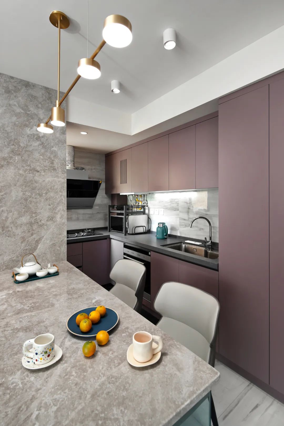 ▲餐桌台面与墙面延伸,统一的材质,摆上精致的茶具果盘,也是显得更加华丽高级而档次。L形的厨房操作台,餐桌也可以作为辅助操作台功能,让做饭用餐空间更加实用轻松。