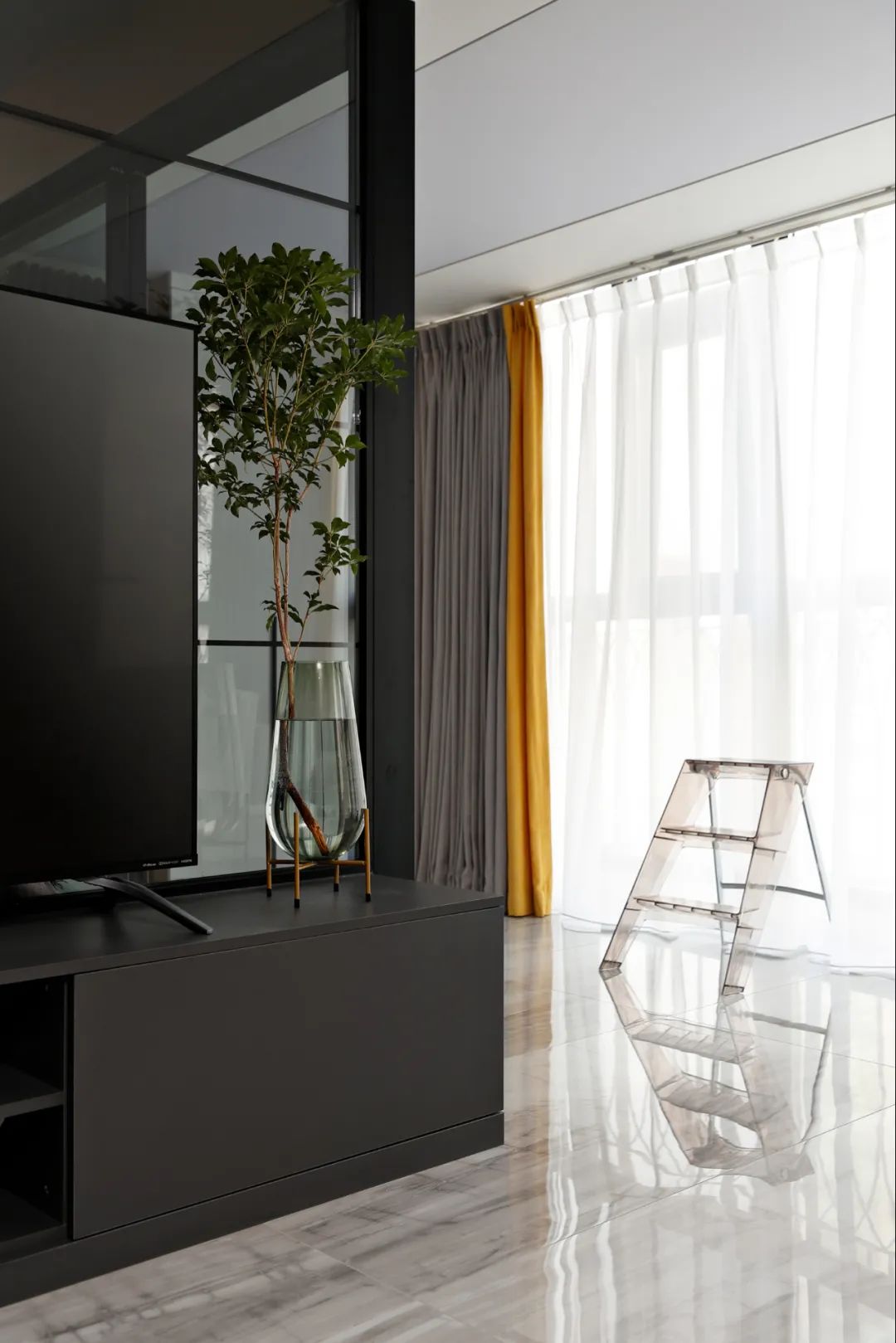 ▲轻奢范的花瓶、窗帘的软装,在细节处点缀出了时尚高级的华丽气质。