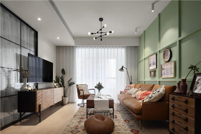 客厅,电视墙做的是玻璃推拉门加大白墙的设计,咖色调的高脚电视柜也显得特别有格调,茶几和电视柜是同款,看起来特别和谐,再来一套同色系的沙发,时尚又舒适,沙发墙刷的是淡青色的漆,搭配线条的设计,看起来特别协调。