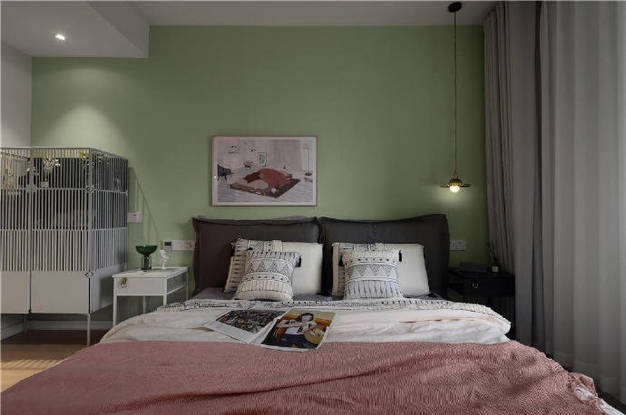 主卧,与沙发墙同色系的电视墙,灰色调的大床搭配粉白色的床品,让卧室看起来更加温馨浪漫。