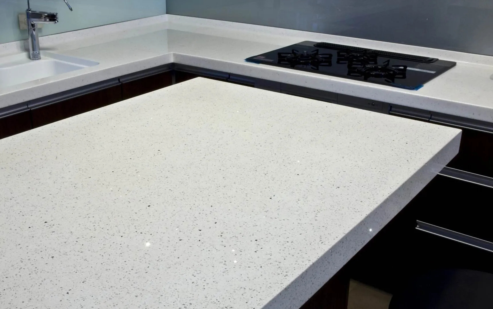 石英石台面是利用碎玻璃和石英砂制成。石英石的优点是耐磨不怕刮划,耐热好可大面积铺地贴墙,做各种厨卫台面,拼接无缝,经久耐用。