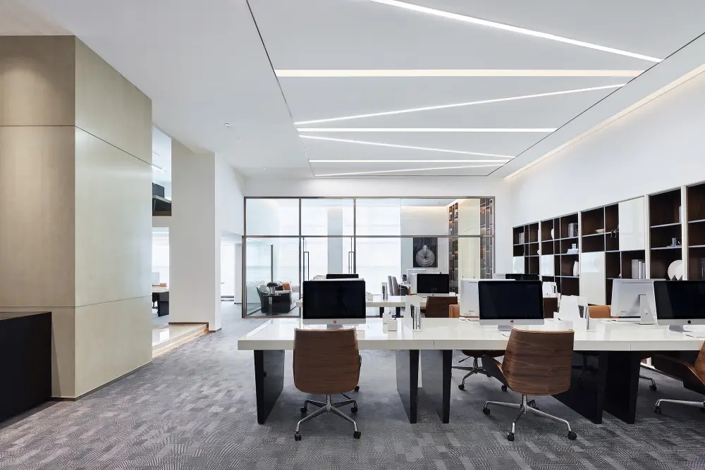 除此之外,在硬装修的材料选择上,如:网络、办公家具等,需要加大投入,因为这些硬件是办公室中的必需用品。贵价的材料,可以多尝试几种不同的表现方式,将材料的价值发挥到更大。