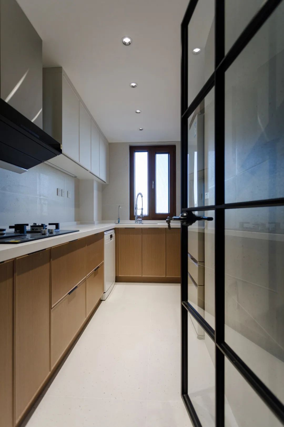 厨房是重新拓展后的格局,变成了L型的新格局,扩增出来有一个凹面,正好用来放冰箱和储物柜。地面铺的是有纹路的瓷砖,明亮的颜色让厨房看上去更加宽敞透亮。