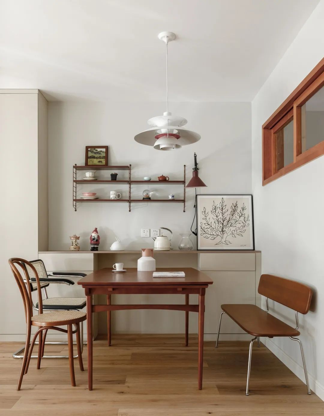 餐厅摆了四方桌,餐边柜中部有一部分镂空,正好可以把桌子嵌入,墙上还挂了隔板,用来放置日常用品。