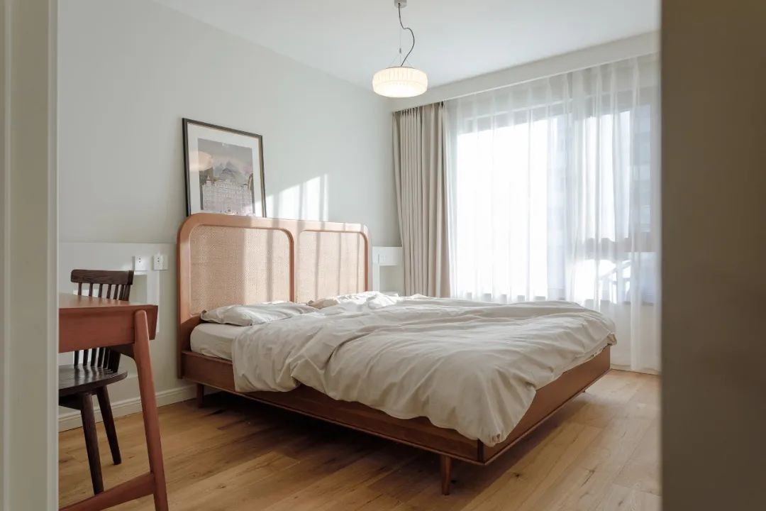 主卧的装修也很简单,木质大床和白色床品,整个氛围非常干净。