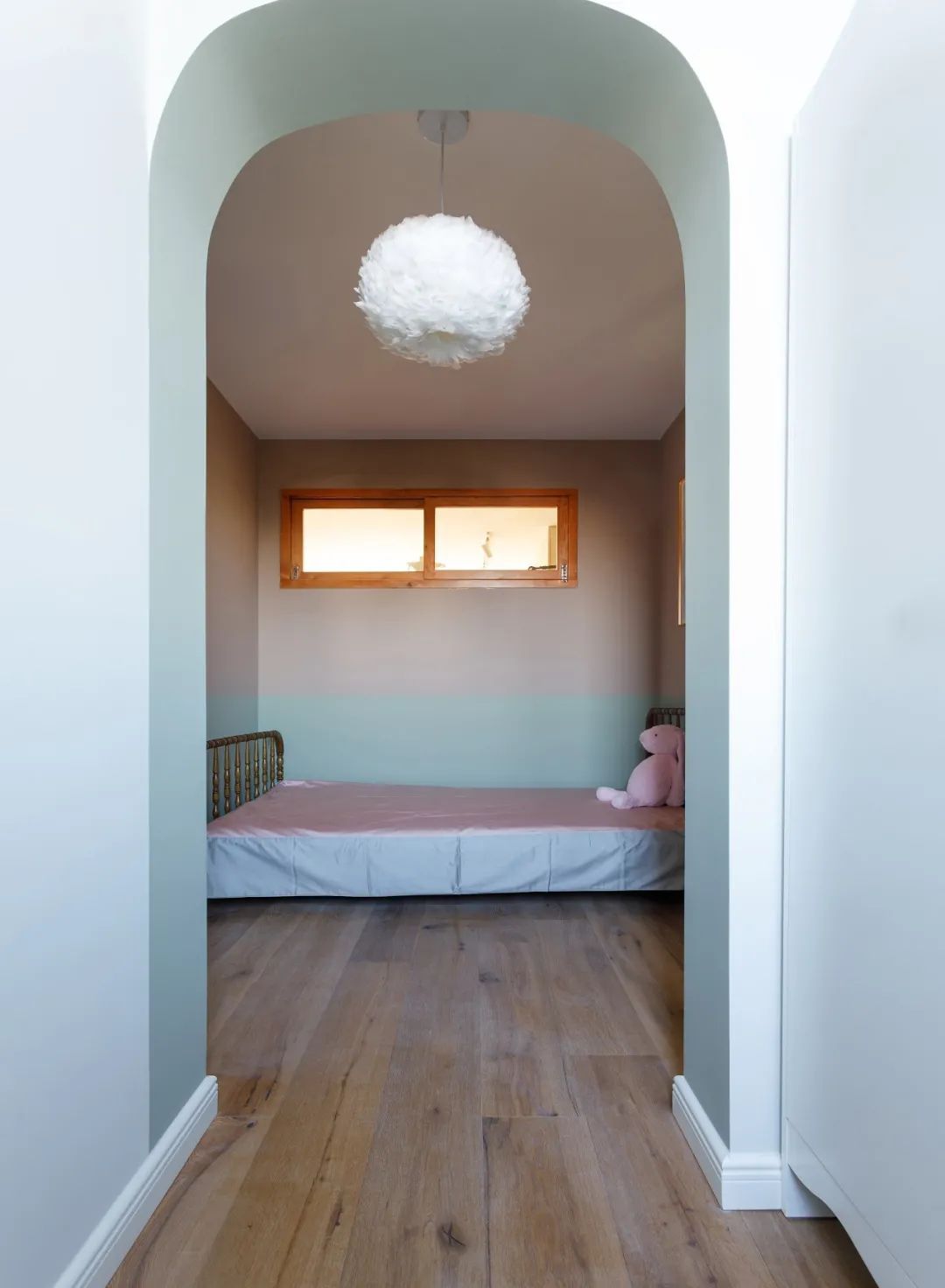 儿童房是在比较角落的房间,为了改善采光,所以暂时没有装门,门洞做成拱形,墙上刷上橙色和淡绿色,摆上孩子喜欢的玩偶。