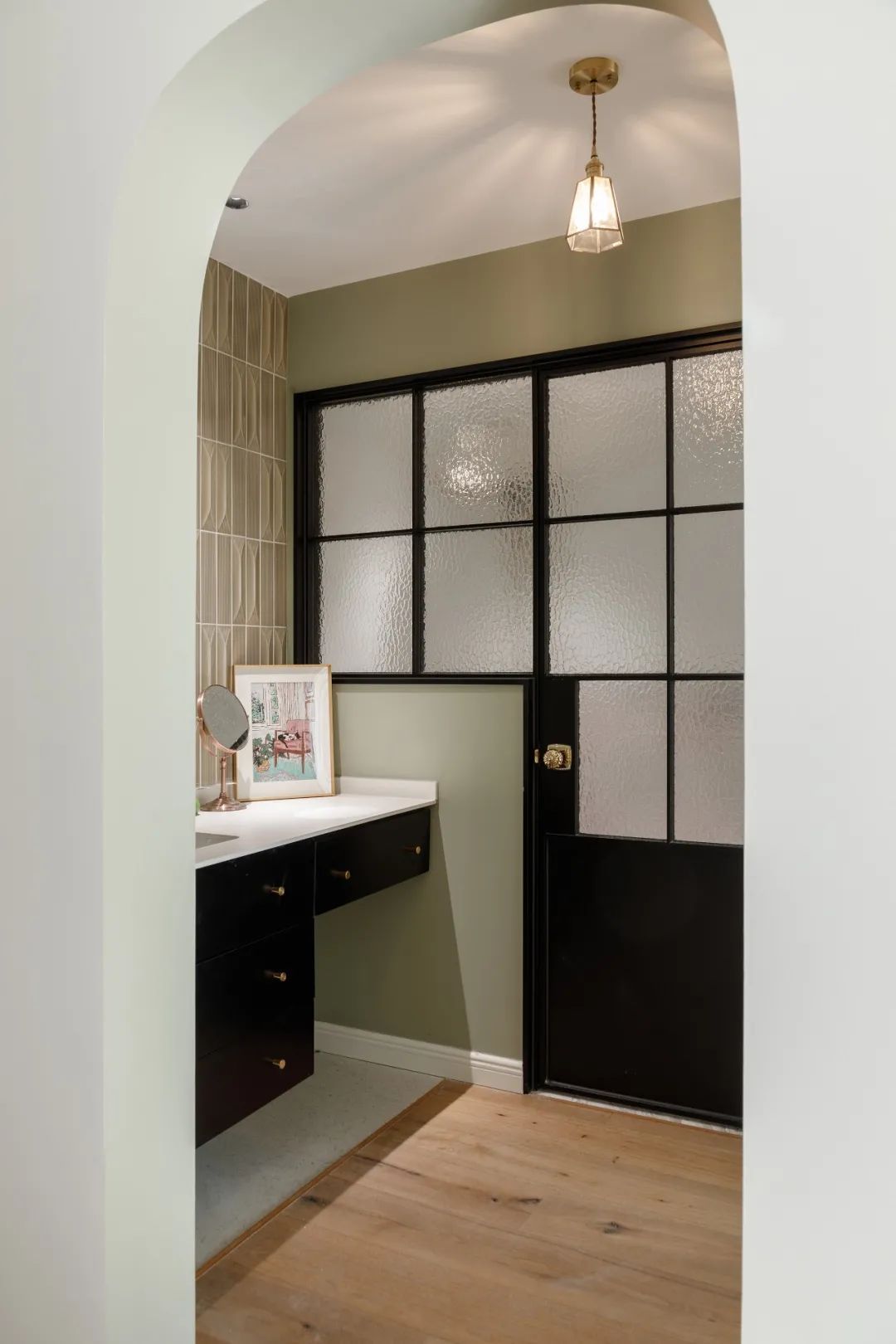卫生间做了二分离,干区半墙刷灰绿色墙漆,半墙贴同色系手工砖,用黑色不落地式浴室柜,搭配金色把手,整体塑造出舒适的氛围。