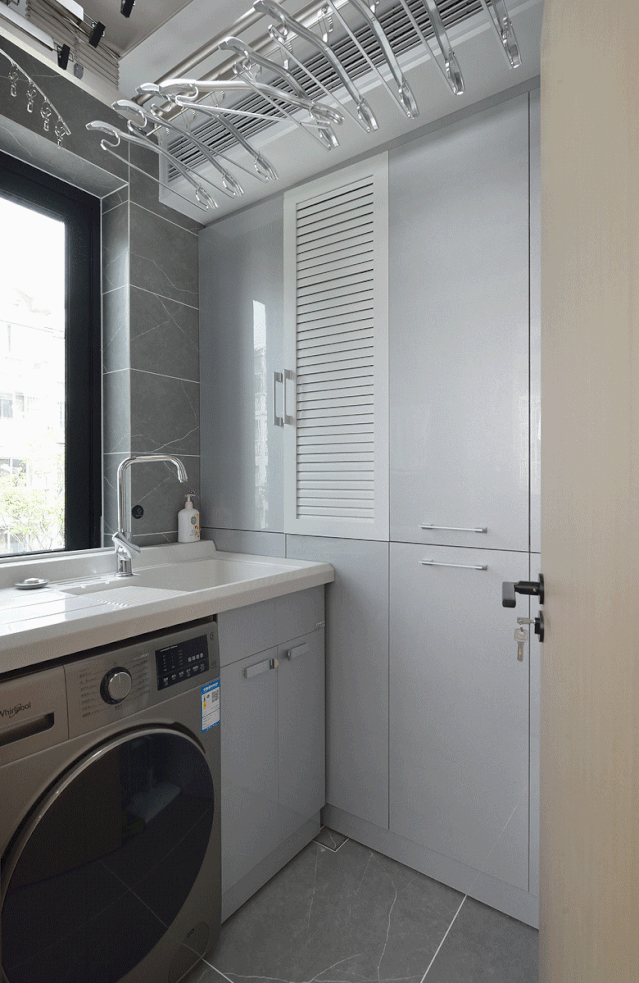 前屋主将小阳台与厨房打通,而现在开放式厨房空间充足,侧面空间显得过于浪费,在设计师的巧思下将其改造为洗衣、晾衣房,整墙收纳柜隐藏着地暖锅炉和各种日常用品。
