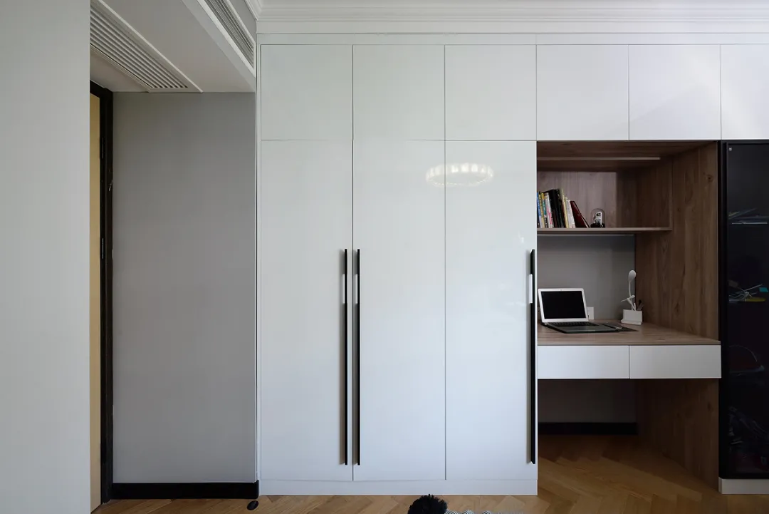 现在的次卧是男主人的临时书房,白色衣柜中嵌入小书桌,这样一体式的定制柜让有限的空间得到最 大化利用。
