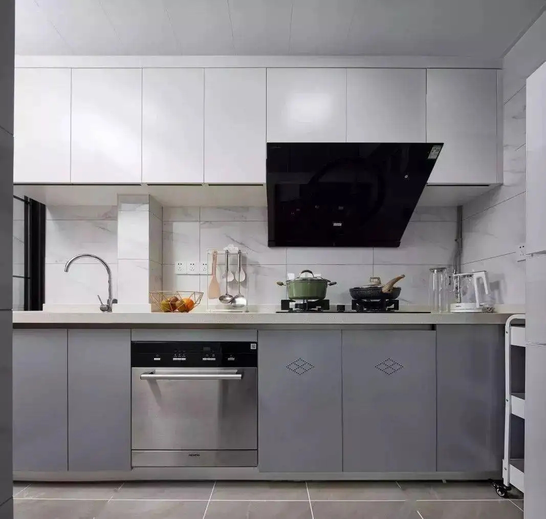 厨房地面建议选用灰色,这种地砖相对更加耐脏,做饭时有点小碎屑掉下来也不会显得很惹眼;并且灰色地砖在风格上也比较百搭,能让厨房装修风格更加美观大气。